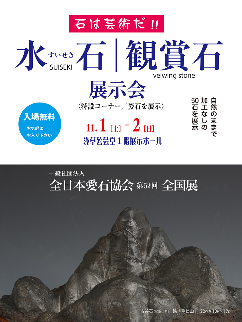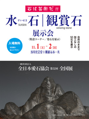 - 一般社団法人 全日本愛石協会は、7月1日(土)〜2日(日)、福島県郡山市のビッグパレットふくしま4階において、東日本大震災復興支援を目的の一つとして、全国各地の観賞石を集めた展示会を開催します。